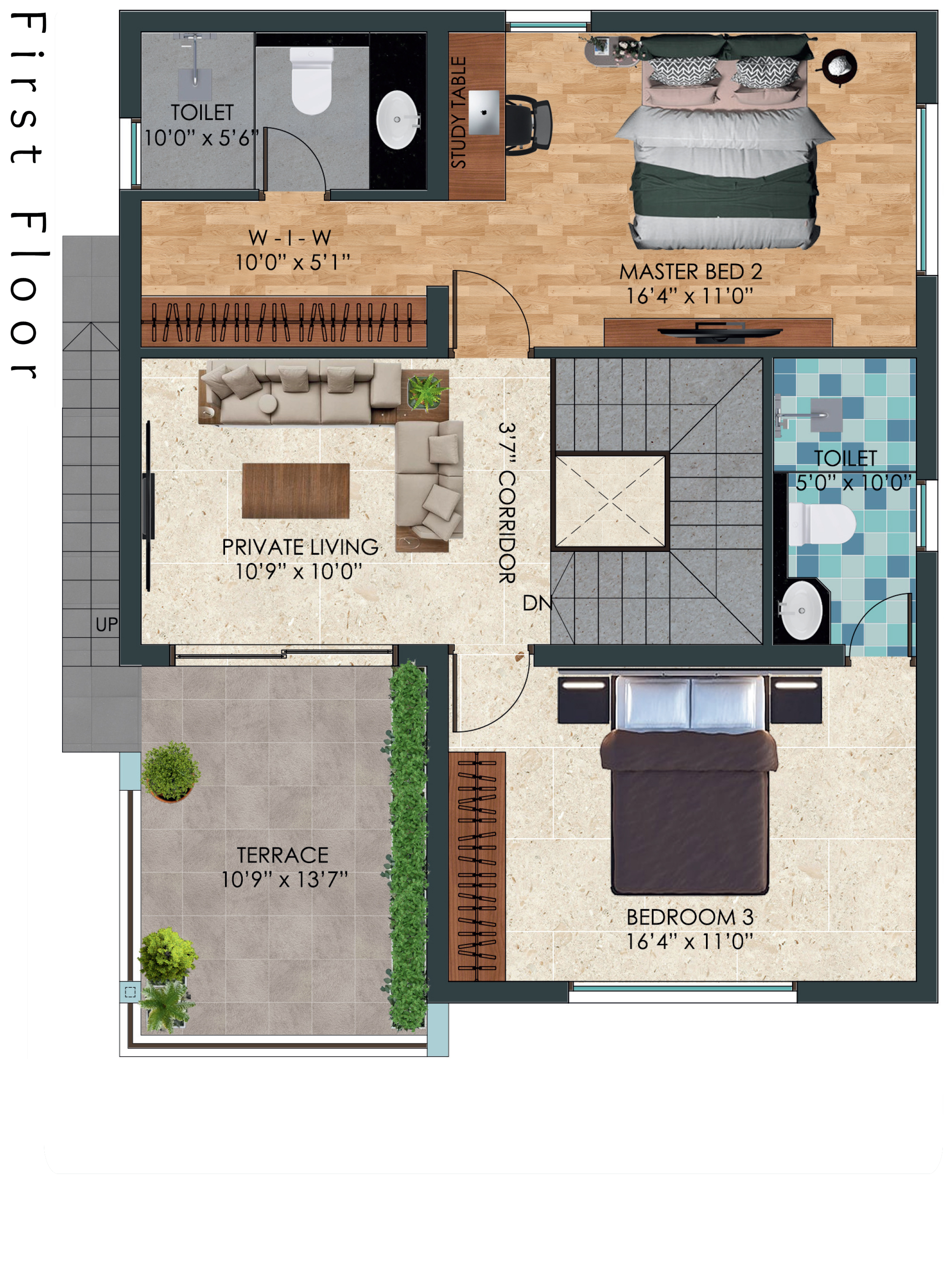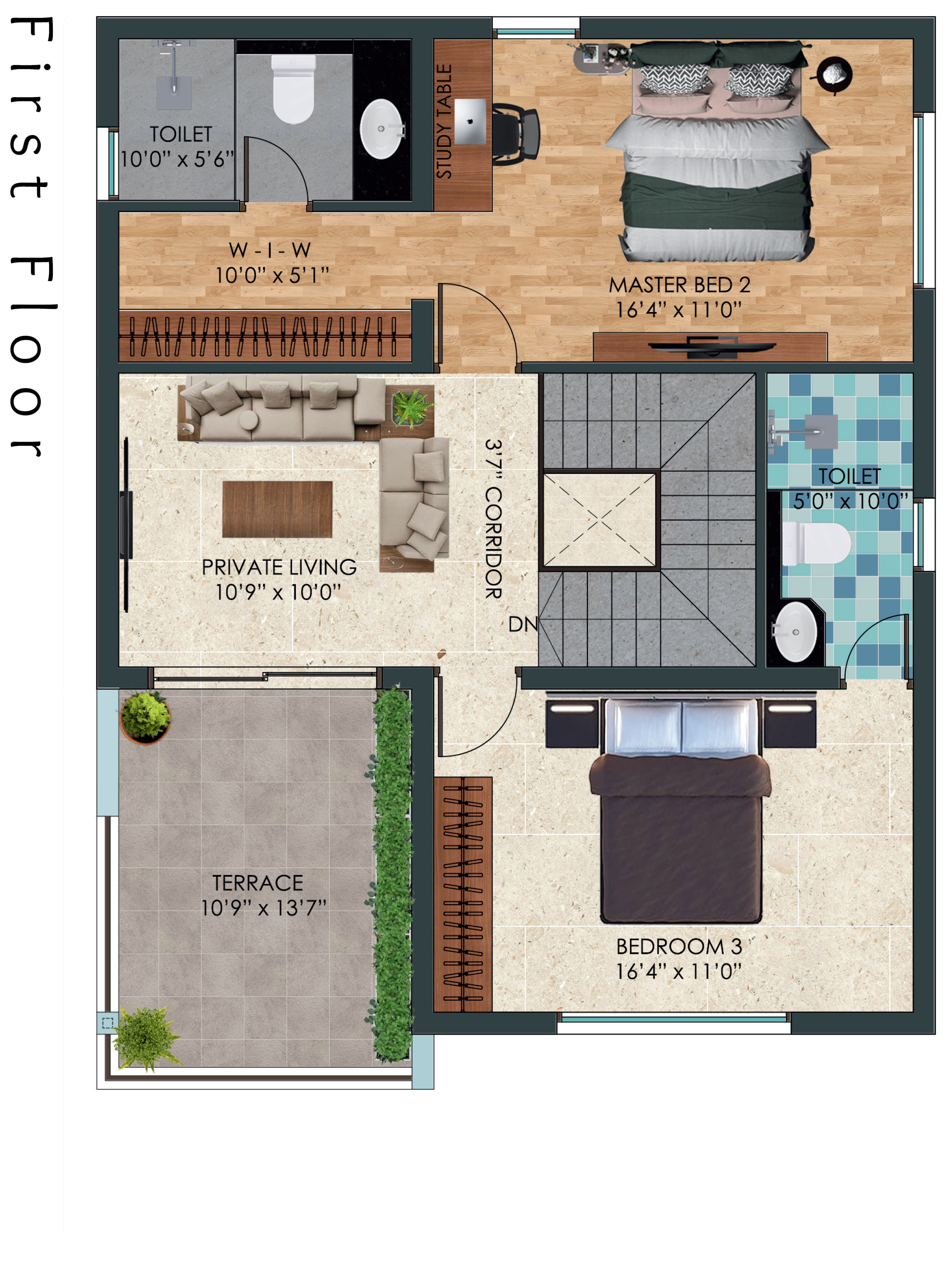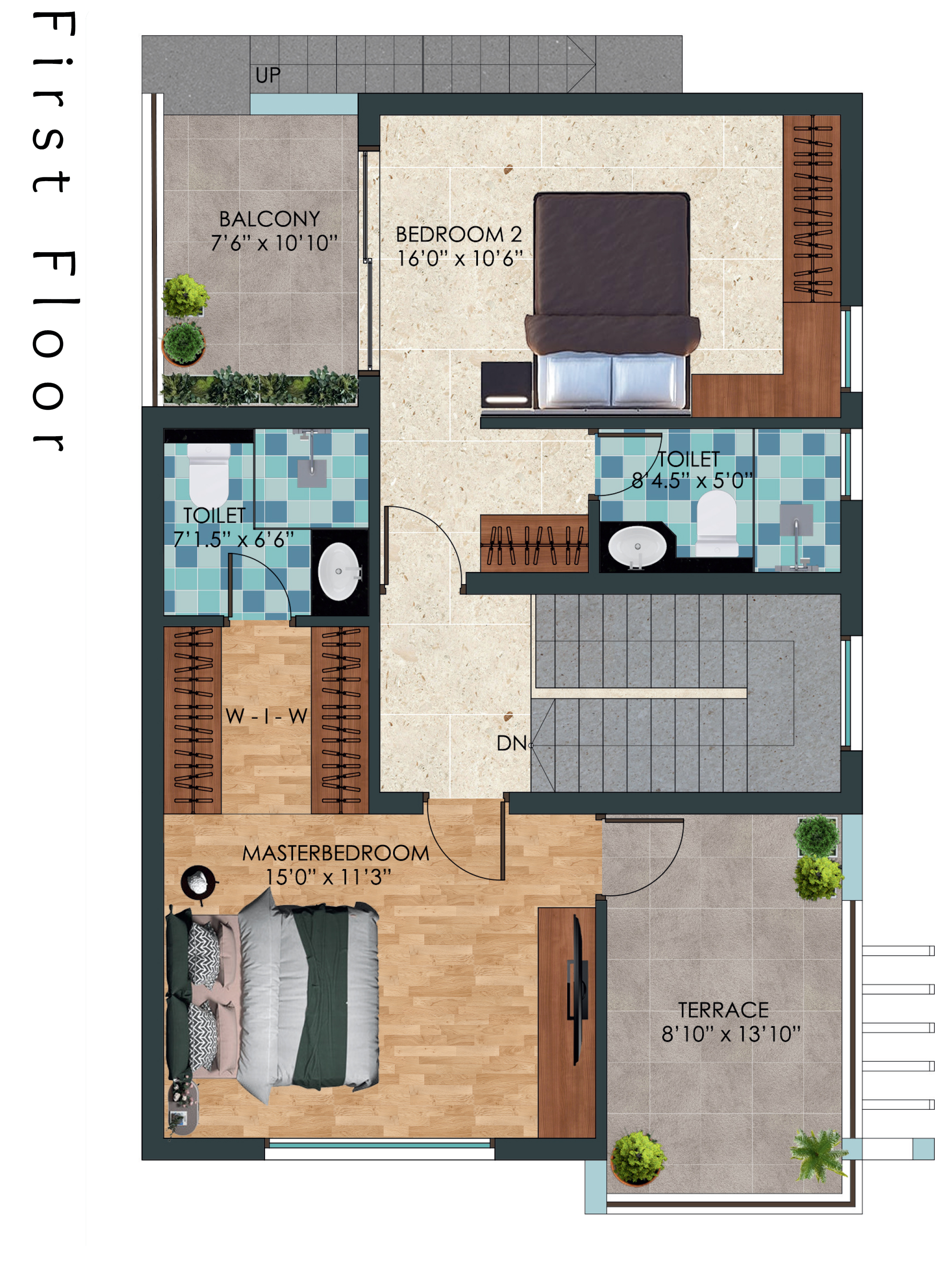 - Other Doors: Laminated flush doors for all rooms and toilets.